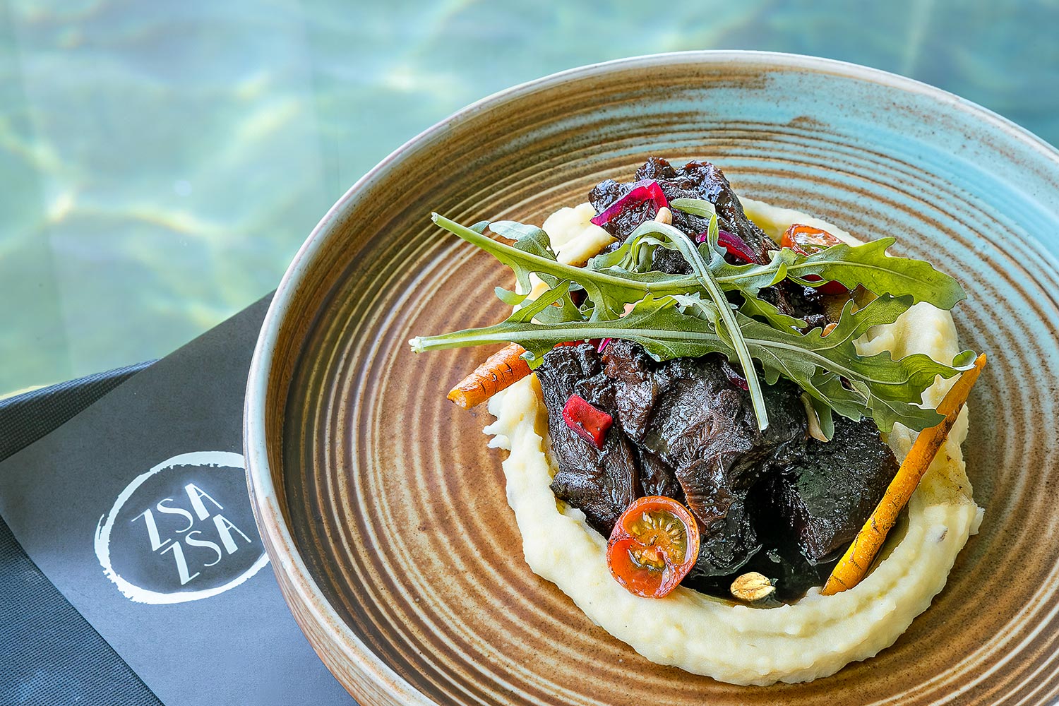 Seguimos con un asado con puré al miso. La carne, cocida durante varias horas a fuego lento, se acompaña de un puré de papas preparado al estilo japonés con miso. El comensal recibe un plato llamativo por el contraste de la vajilla y su cuidada presentación. Acompañado de rúcula, tomates cherry y bastones de zanahoria, cada bocado es un verdadero deleite.