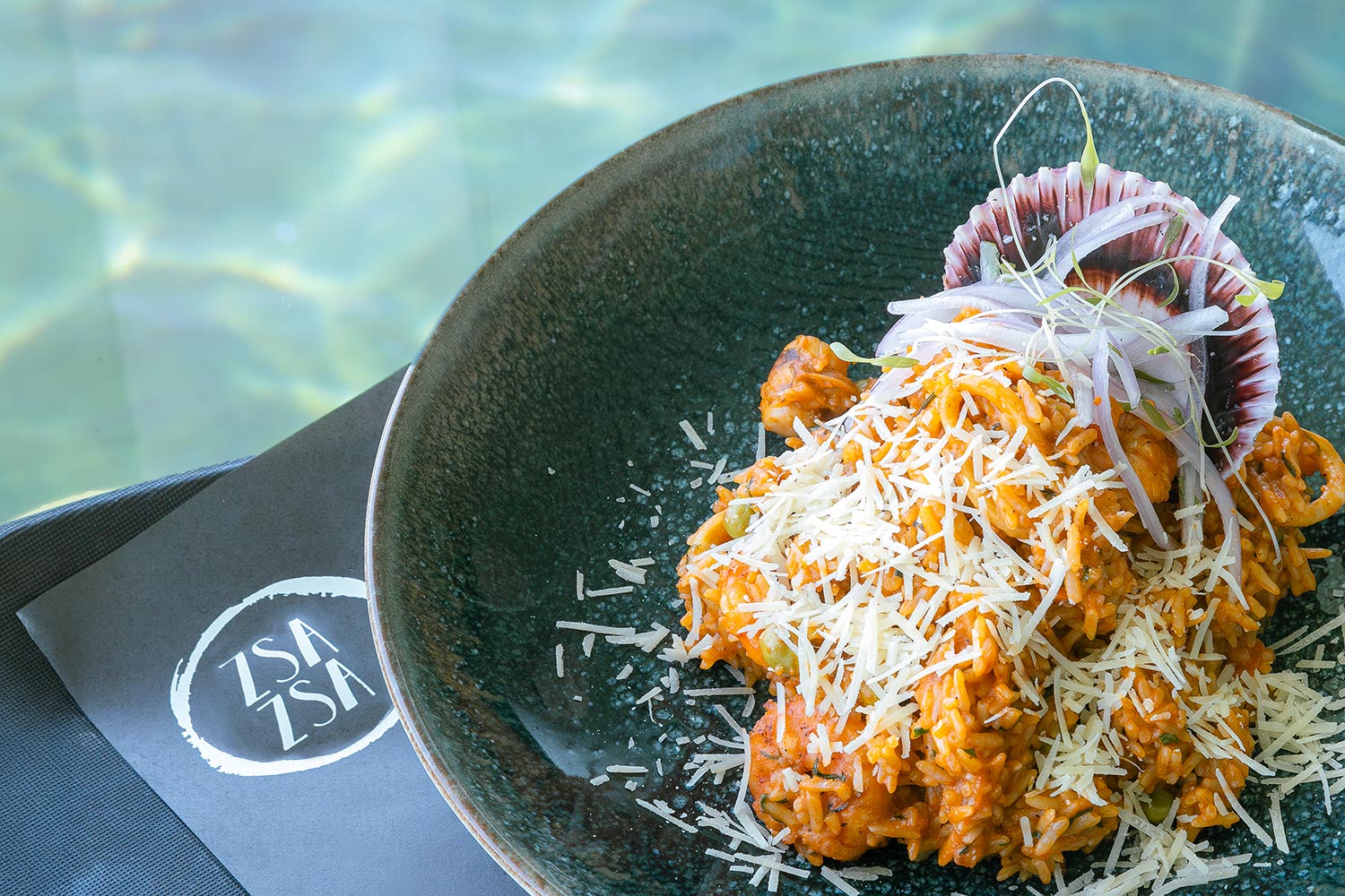 Por último, en una propuesta más local, nos presentan un arroz con mariscos en el que el tono naranja del arroz, la generosa porción de mariscos y frutos del mar —coronados con concha de abanico, sarza criolla y una lluvia de queso parmesano— elevan este clásico a una versión de alta gama, sin perder su esencia tradicional.
