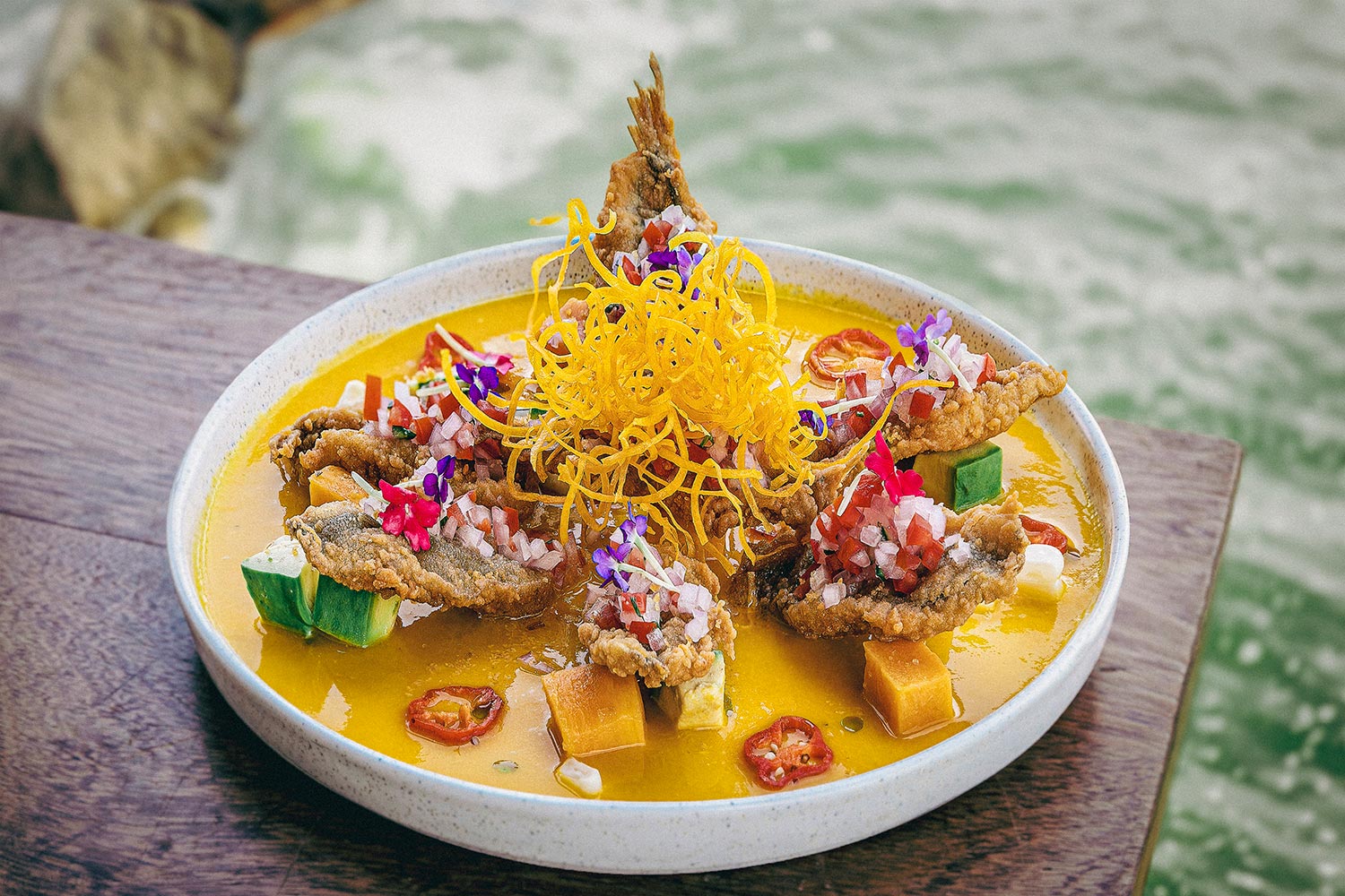 Entre sus recomendaciones destaca el ceviche de pejerrey crocante. El chef Omar Fernández nos explica que el plato es preparado con “una base de ají amarillo y leche de tigre”. Sobre el pejerrey se añade una chalaquita —mezcla de cebolla en cubos, tomate, ají limo, ají amarillo, limón y culantro— junto con camote glaseado, palta y choclo como guarnición.